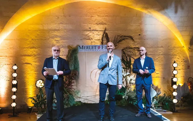 En 2023, la famille Merlet a célébré le jubilé de Gilles, marquant ses 50 ans à la tête de la distillerie, et a officialisé la transmission de l’entreprise à ses fils, Pierre et Luc. À l’origine, les Merlet sont viticulteurs et distillateurs pour les grandes maisons de cognac. Firmin Merlet, l’arrière-grand-père, installe les premiers alambics en 1850, près du village de Saint-Sauvant. La relève est assurée par Édouard, qui devient bouilleur, puis par son fils, Guy, qui développe la structure. Dans les années 1970, Gilles succède à son père, puis, en 1980, il plante du cassis. Une liqueur voit le jour et sera suivie par neuf autres. La marque Merlet est lancée. En 2001, la distillerie est contactée pour créer Hpnotiq, une liqueur qui renforce son succès. 2010 voit l’arrivée du premier cognac, suivi par toute une gamme. La maison ne cesse de se diversifier, d’abord avec la vodka, le whisky, puis avec le rhum et le gin.