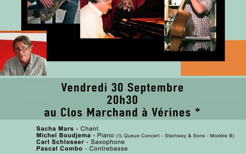 L’association Vérines Animations vous propose un moment musical et festif autour d’un concert de Jazz, le vendredi 30 septembre prochain. Buvette et petite restauration sur place à partir de 19h, concert chant (Sacha Mars) piano (Michel Boudjema) saxo (Carl Schlosser) et contrebasse (Pascal Combo) à partir de 20h30.